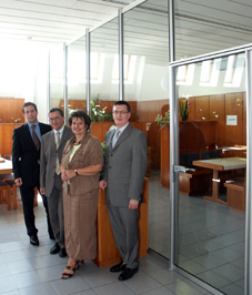 Im Bild: Dipl. Ing. Hoppe und die KollegInnen Mag. Filaus, Mag. Leeb und Jakubovits vom BAWAG Betriebsrat vor der neuen Trennwand.